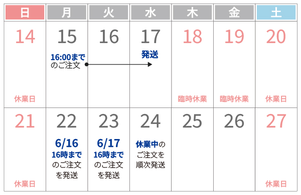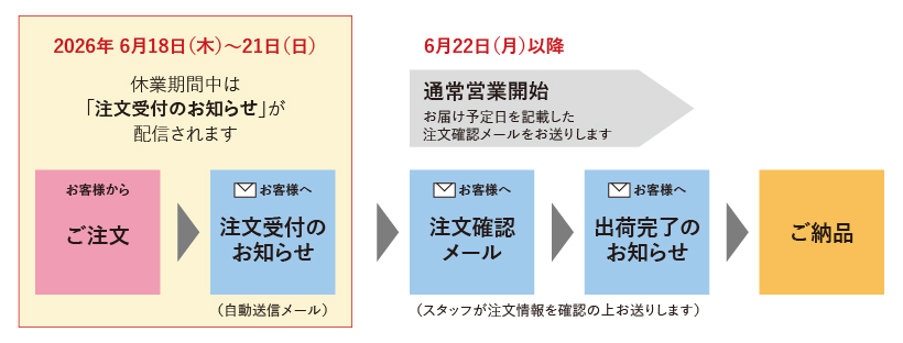 休業期間前後は通常とは出荷スケジュールが異なる場合がございます。ご注文の際は余裕をもった納期でのご発注をいただけますようお願い申し上げます。